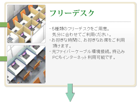 ちょっとしたスペースのレンタルオフィスがあればお仕事ができる方向けに机を解放しています。もちろんレンタルオフィスにはビジネス用のご住所、電話番号、光ファイバーケーブル接続環境、電源等の環境も整っています。 当レンタルオフィスでは5種類のフリーデスクをご用意していますので、気分に合わせて、お好きな時間に、お好きなお席をレンタルオフィスとしてご利用ください。 |
