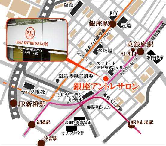 | 東京メトロ日比谷線・都営浅草線 「東銀座」駅 徒歩4分 東京メトロ銀座線「銀座」駅 徒歩6分 東京メトロ銀座線・都営浅草線 「新橋」駅 徒歩7分 JR「新橋」駅 徒歩8分 |